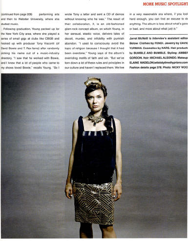 Following graduation, Young packed up for the New York City area, where she played a series of small gigs at clubs like CBGB and hooked up with producer Tony Visconti (of David Bowie and T. Rex fame) after randomly picking his name out of a music-industry directory. "I saw that he worked with Bowie, and I knew that a lot of people who came to my shows loved Bowie," recalls Young. "So I wrote Tony a letter and sent a CD of demos without knowing who he was." The result of their collaboration, X, is an old-fashioned glam-rock concept album, on which Young, in her sensual, elastic voice, delivers tales of deceit, murder, and infidelity with punkish abandon. "I used to consciously avoid the topic of religion because I thought that it had been overdone," Young says of the album's overriding motifs of faith and sin. "But we've torn down a lot of these rules and principles in our culture and haven't replaced them. We live in a very reasonable era where, if you look hard enough, you can find an excuse to do anything. The album is less about what's good or bad, and more about what just is."
