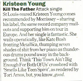 Morrissey about KY "Kristeen's single is 'Kill the Father' and is the best song I've heard for 50 years. I especially love the line "strangle Bowie with/his neckerchief" which, you must agree, is quite an idea. Kristeen is from St Louis - which, I am told, is another way of saying Mars [although I really shouldn't say this in view of the fact that we play St Louis in November.] Kristeen is a dramatic woman - monumental vocal gifts, unwalkable heels, hypnotic way with the keyboard, and underneath it all she is still 16 (and a half.) I watch her set every night and I am dazed. I was thrilled by audience reactions to Kristeen - especially in Iceland and Italy where their intakes of breath could be heard as Kristeen ripped into the high notes. She is an artist who adapts the world to her own needs, which I appreciate. There's no other way." |