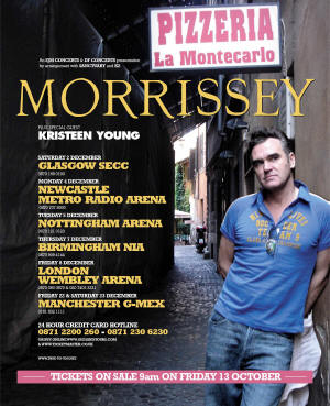 KY ABOUT TOURING IN ITALY "We are particularly excited about playing these Italian shows...since we have never played in Italy before....and since Morrissey's latest album, Ringleader of the Tormentors, is based on an Italian theme. These nights should be unforgettable. If you haven't bought Ringleader of the Tormentors, you definitely should. The first song in particular, "Far Off Places", is one of a kind....and the song, "To Me You Are a Work of Art", makes me cry. The whole album has real depth and, of course, Morrissey's sharp as a Gucci suit lyrics." |